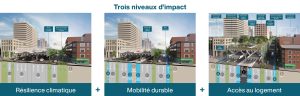 Le rendu qui accompagne cette lettre montre ce qu’il serait possible d’accomplir en créant une dalle coiffant les voies autoroutières, un modèle qui pourrait servir des objectifs multiples et urgents. Une portion de la dalle pourrait être réservée pour des unités locatives et du logement social, répondant ainsi à la crise du logement. Un parc linéaire améliorerait la qualité de l’air aux abords de la Métropolitaine tout en réparant la fracture dans le tissu urbain. Du transport collectif efficace pourrait être inséré dans le tracé, réduisant les temps de transport autant que la dépendance à l’automobile. En somme, nous nous doterions d’installations longues de plusieurs kilomètres qui atténuent l’impact des canicules, inondation et autres phénomènes climatiques extrêmes; qui facilitent la mobilité durable; et qui donnent accès à de nouveaux logements de qualité.