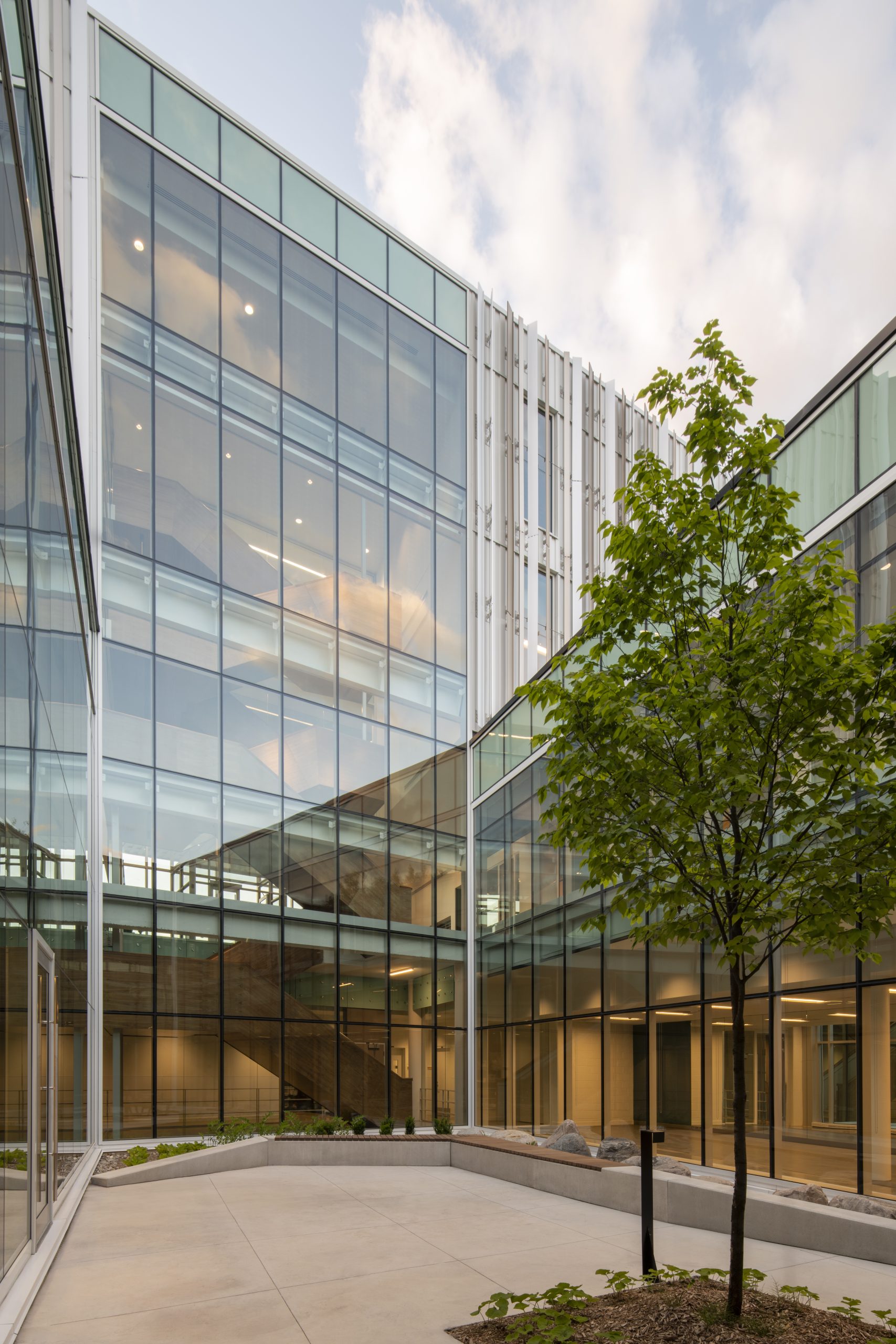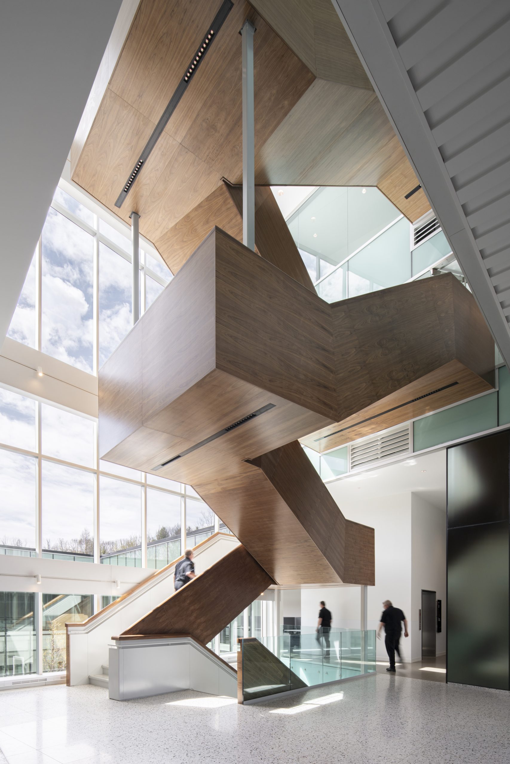 À l’intérieur, la lumière et la visibilité guident l’expérience, avec des corridors vitrés, des cours intérieures et de hautes fenêtres qui créent un milieu de travail lumineux et décloisonné, propice à la collaboration et au bien-être. Les stratégies de développement durable, inspirées de l’approche NET POSITIF™, traversent l’ensemble du projet : puits géothermiques, toit vert visible depuis les espaces de travail, et ailettes d’aluminium qui régulent l’apport solaire pour contribuer aussi bien au confort qu’à l’efficacité énergétique.