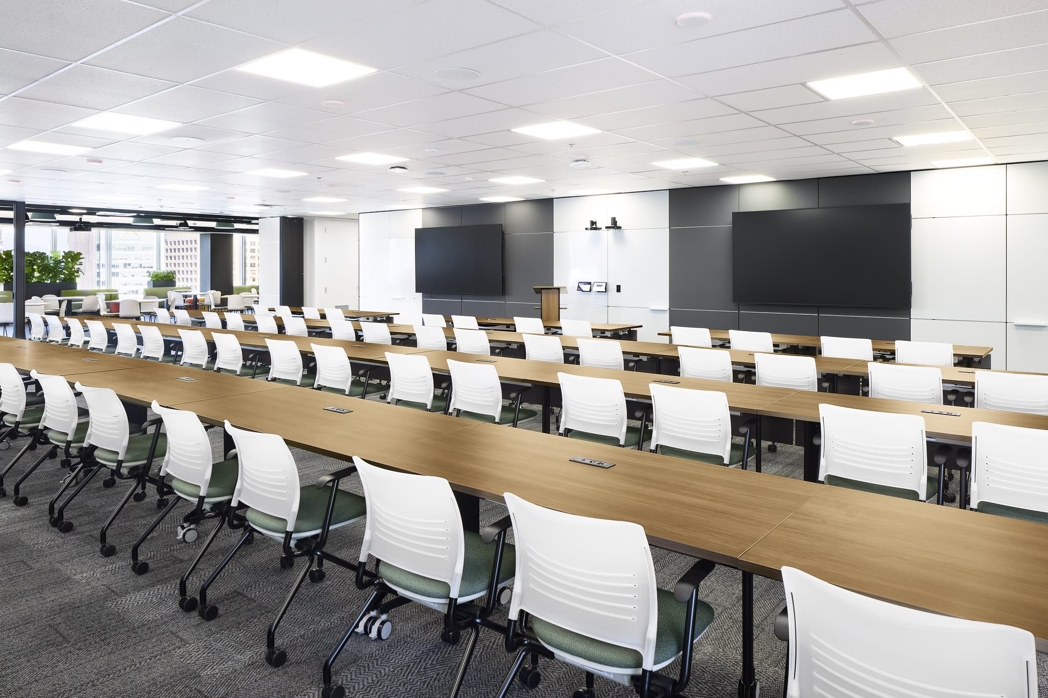Numerous design elements have been introduced to promote team spirit. For instance, a substantially sized bistro was designed into the space, with specific amenities that are not available on other floors. The design intent is to encourage people who don’t interact on a day-to-day basis to gather and mingle, and to foster a sense of community within the larger team. Additionally, an operable wall between the bistro and an adjacent training room can be opened to create a larger gathering space for events and parties.