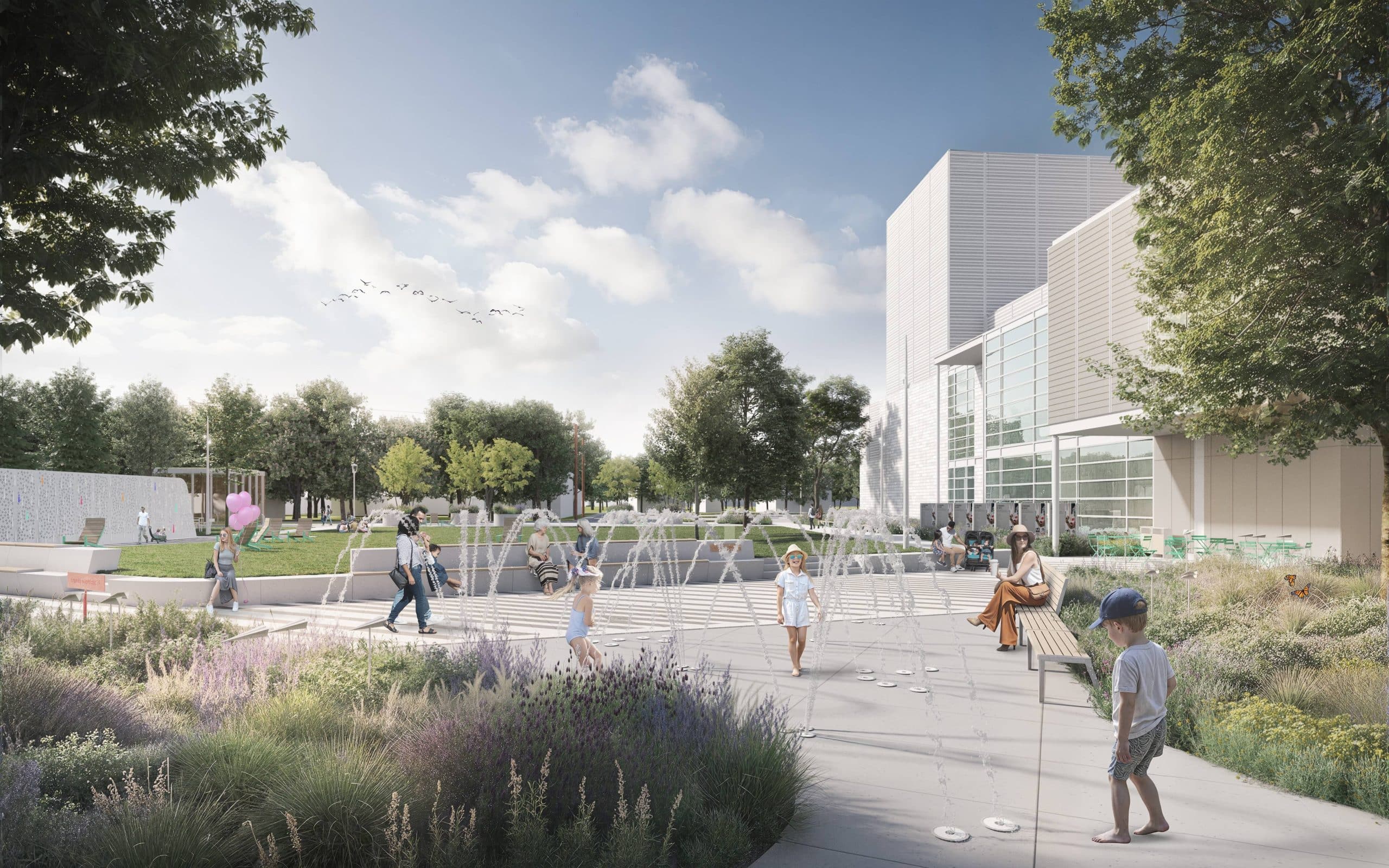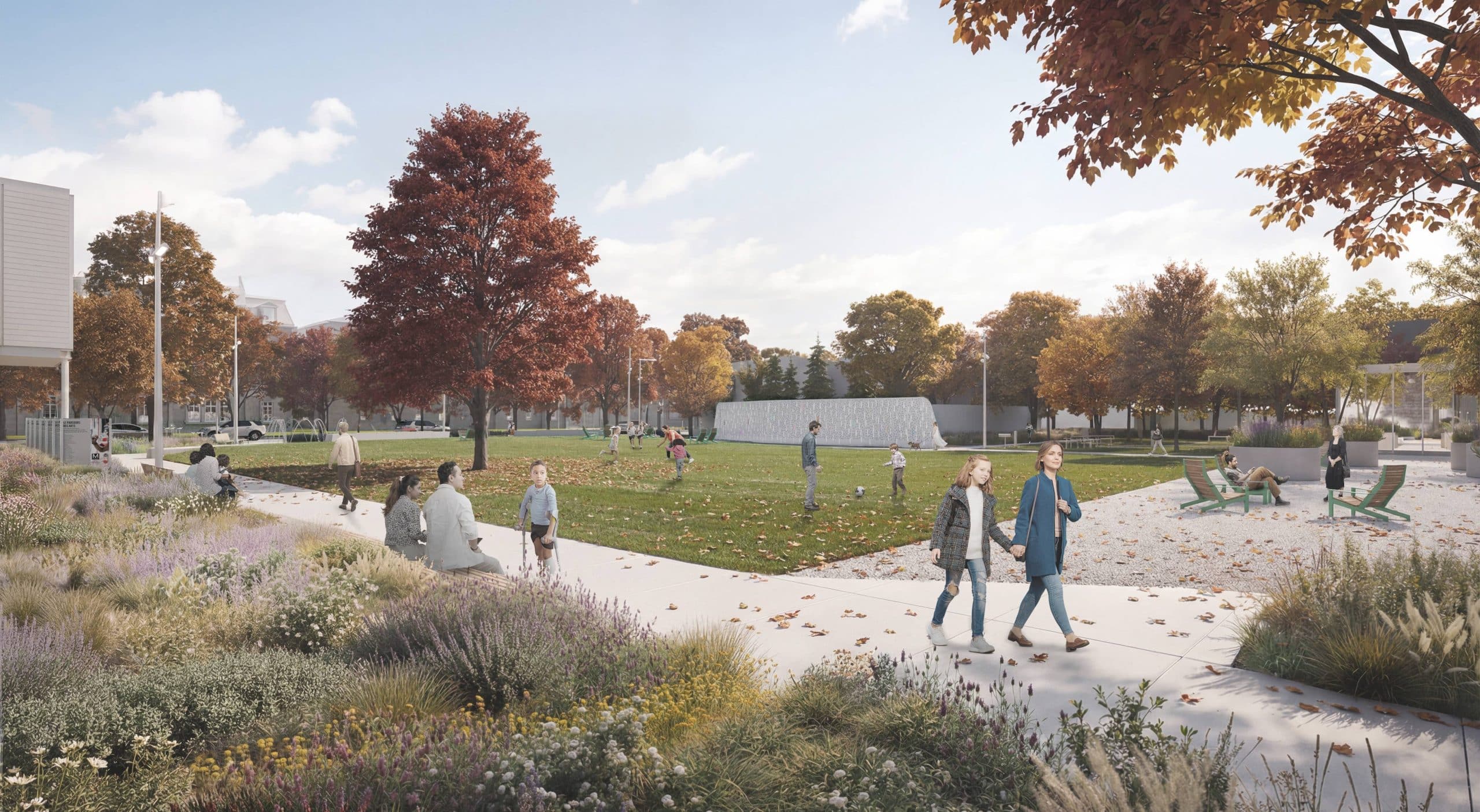The various landscaping components include a low wall, a large turf bed, an urban esplanade, a fountain and a green oasis, as well as a renewed forecourt for the Hector-Charland Theatre, which borders the square on its eastern flank. On the other side of the park, a new pavilion houses dressing rooms, a multipurpose hall and public restrooms.